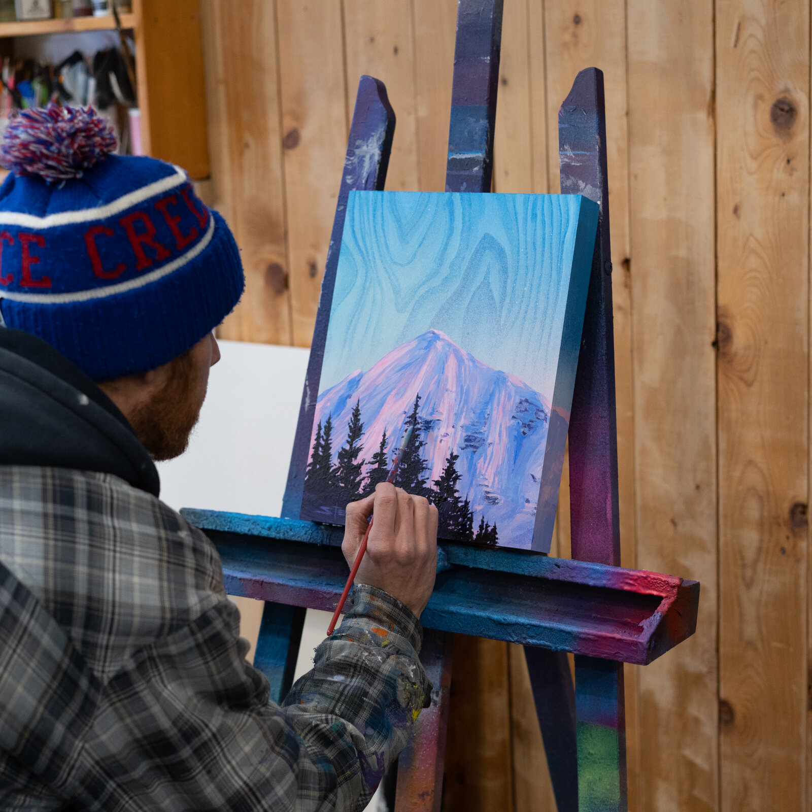 After attending KSA in 2002, he became inspired to paint mountain landscapes. He enjoys working with acrylic and oil paint, and feels somewhat like an instrument, letting the knife, brush, and paint create the natural patterns and thick, rough textures of mountains.