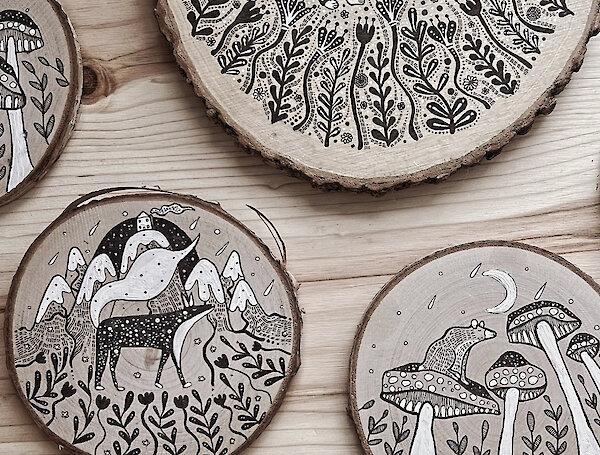 After working as a self-taught illustrator, Imogen spent a year studying ceramics at the Kootenay School of the Arts in 2023, marking the start of her exploration with clay. This shift from detailed line drawings to working with raw materials deepened her creative process, leading to a new focus on combining earthy textures with her detailed illustrations. Her work now bridges the gap between two-dimensional art and experimental use of different mediums and surfaces.
